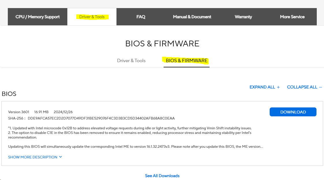 This is the page we are looking for! It contains the download link to the new BIOS for all of the new stability fixes. Let's proceed to download the file and look for it in the folder you downloaded it to and extract it: