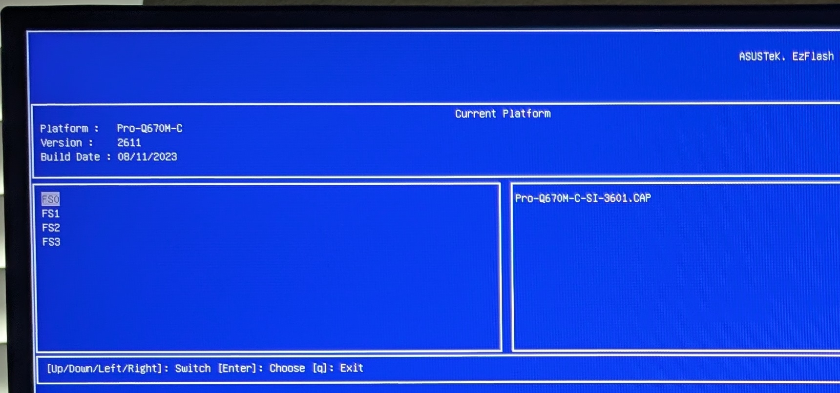 You can see on the left there are several entries starting with "FS". These are all of the storage drives your motherboard sees - USB drive or not. For me, the first entry "FS0" clearly has the BIOS file that we copied over from Windows. Using the arrow keys, we can navigate to it and press enter to begin the installation process: