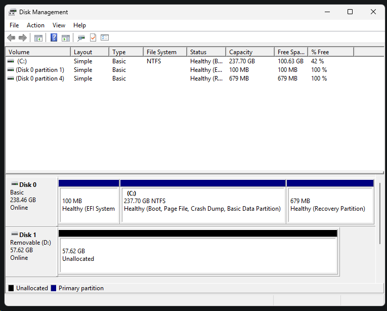 Search for either "Disk Management" or "diskmgmt.msc" in Windows Search. When you open it, you should see a screen like this: