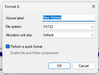 Be sure to select "FAT32" as the option. The size of the new file system could be whatever you want below or up to the capacity of your USB drive, but a safe and common option is 4GB (which is the same as 4096MB).