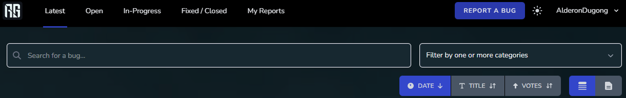 If your issue hasn’t been reported yet, click the blue 'Report A Bug' button next to your username.
